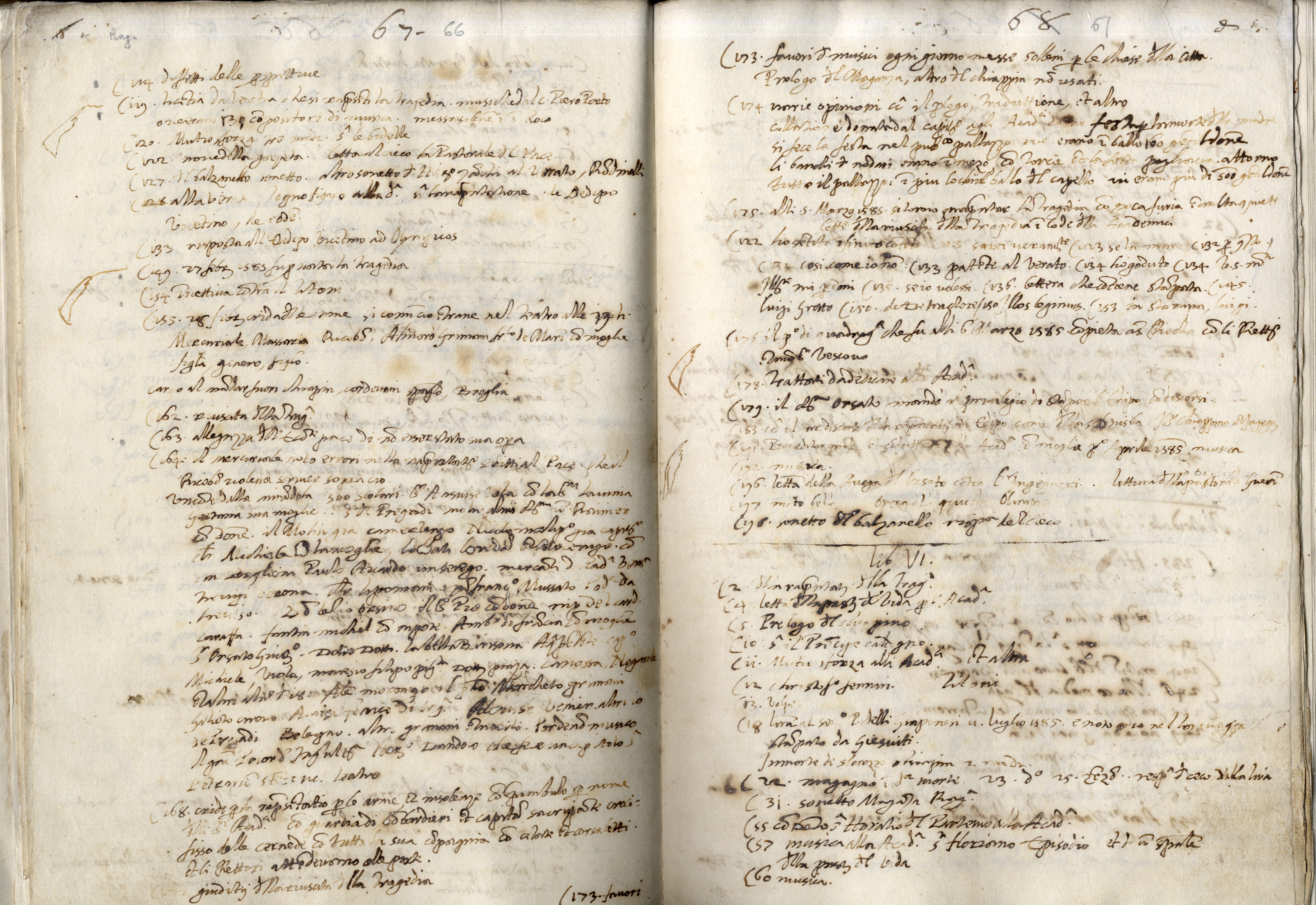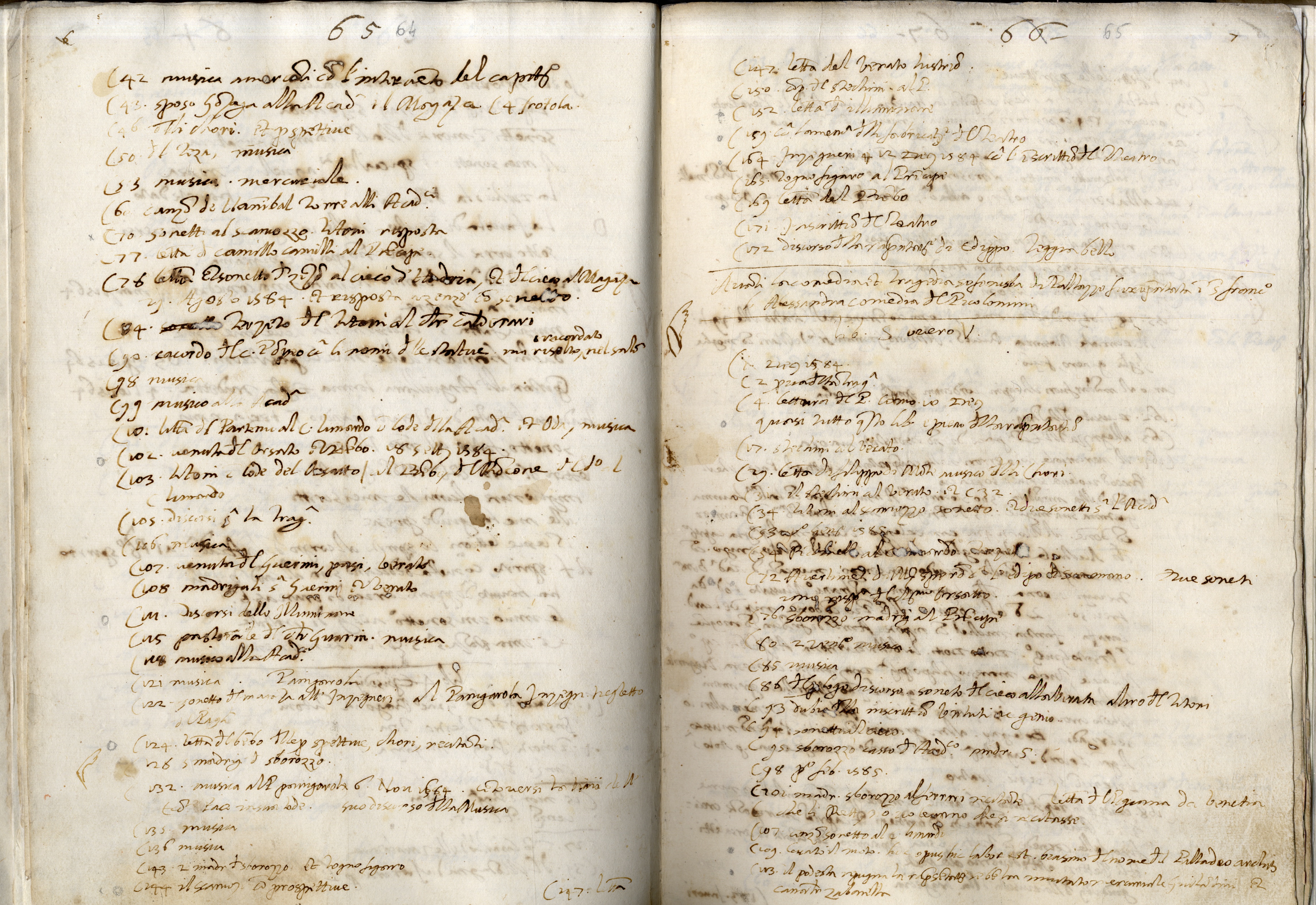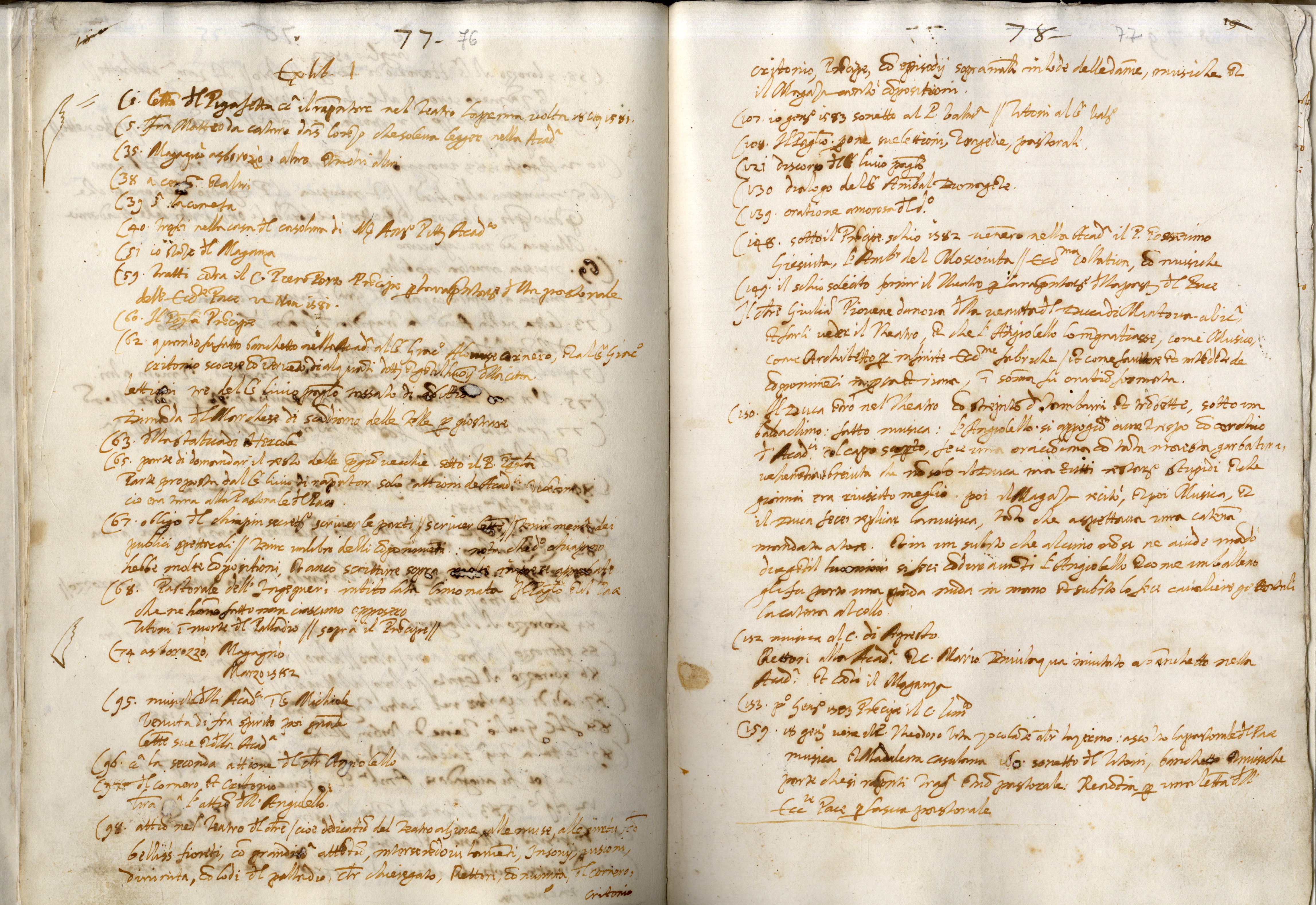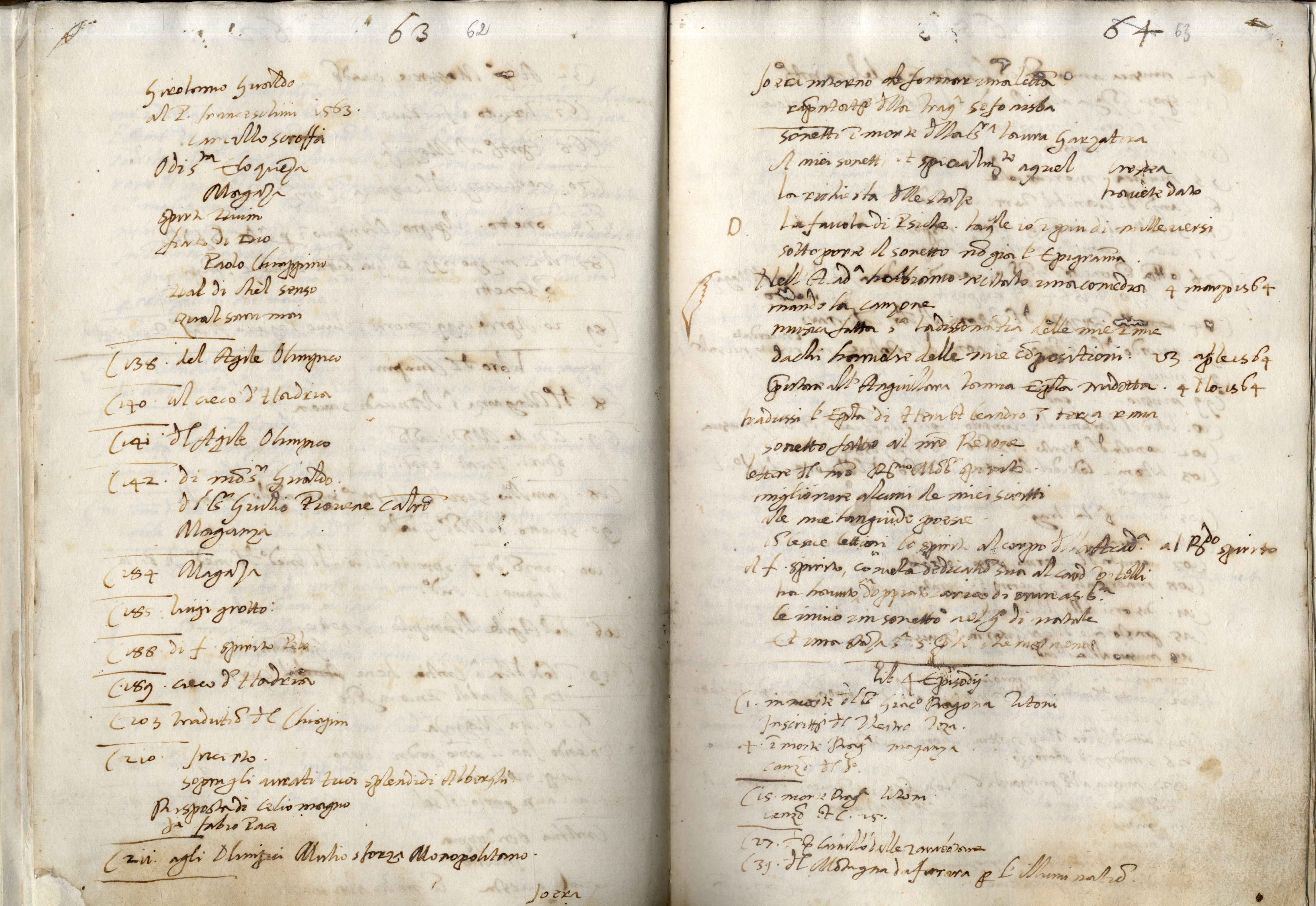 AO b1 f1 libro segnato A, pp. 63-67, p. 72, p. 76 – annotazioni sulla rappresentazione, tra cui note sull’illuminazione (con la nomina di Antonio Pasi “Montagna da Ferrara”), note sui consigli dati da Paolo Teggia, Sperone Speroni, Battista Guarini sulla rappresentazione e sugli ingaggi degli attori
