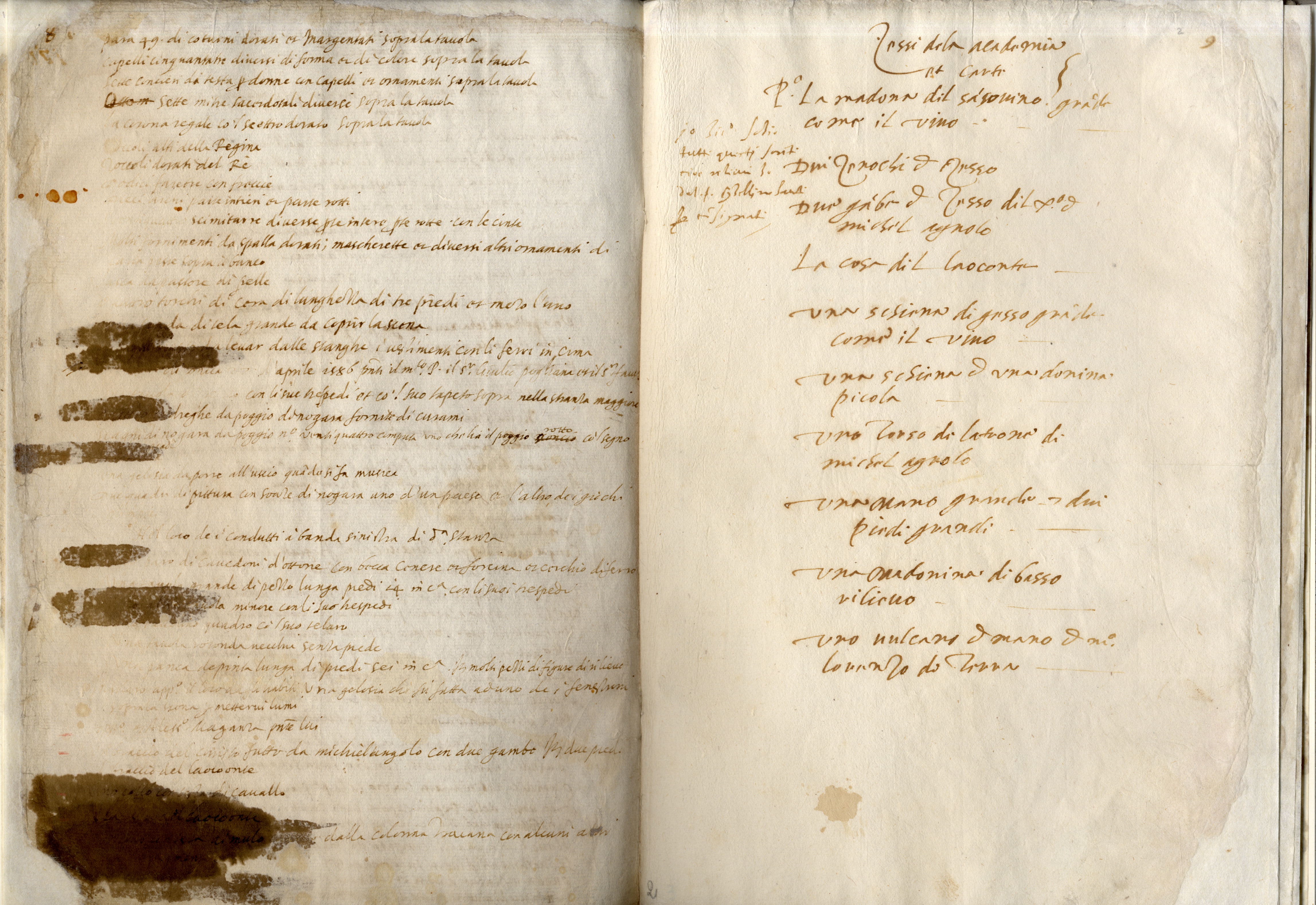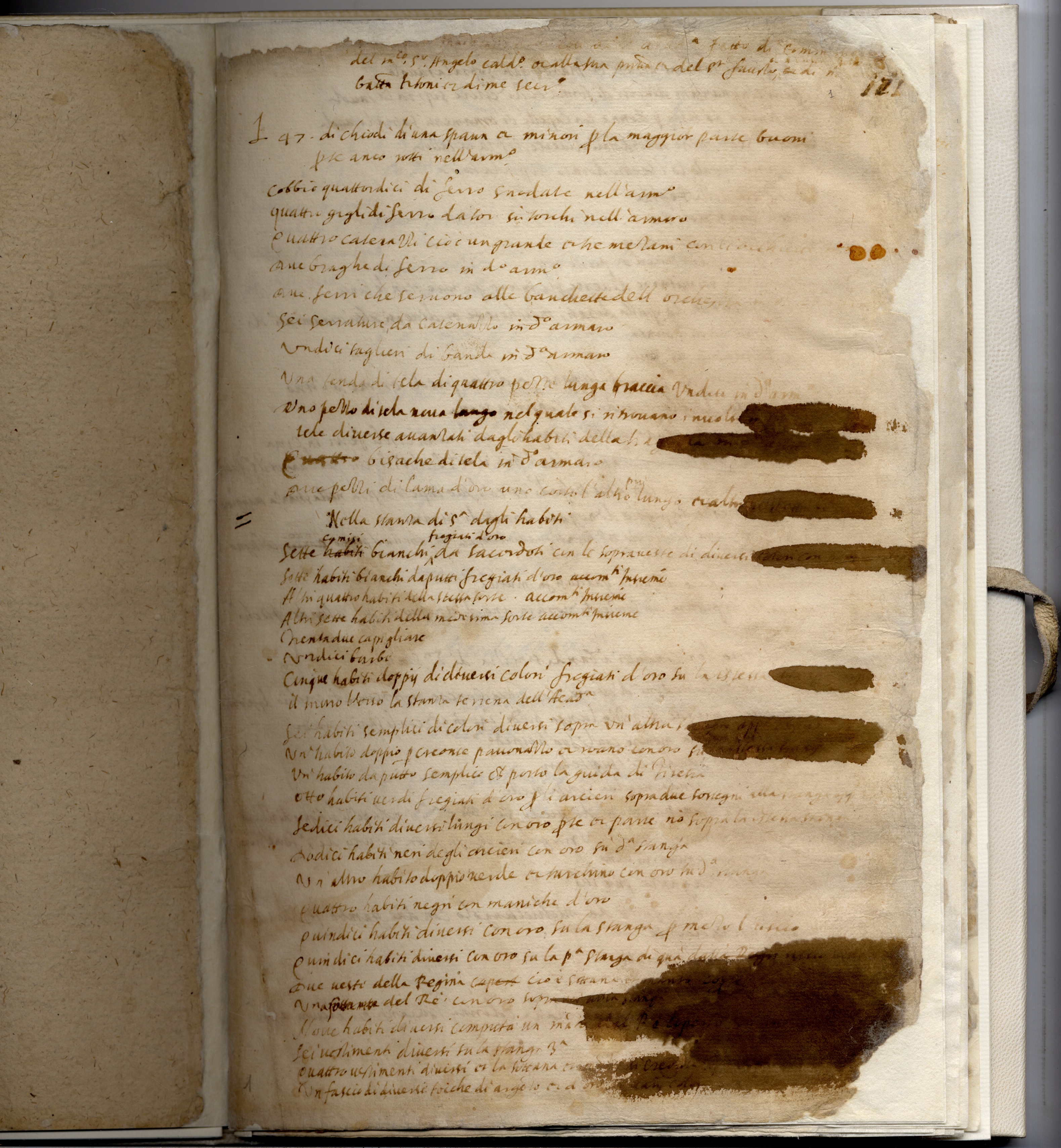 AO b1 fasc 2, libro segnato B, p. 1rv – inventario degli oggetti di proprietà dell’Accademia Olimpica contenente anche l’elenco dei costumi utilizzati per la rappresentazione inaugurale, 28 giugno 1586