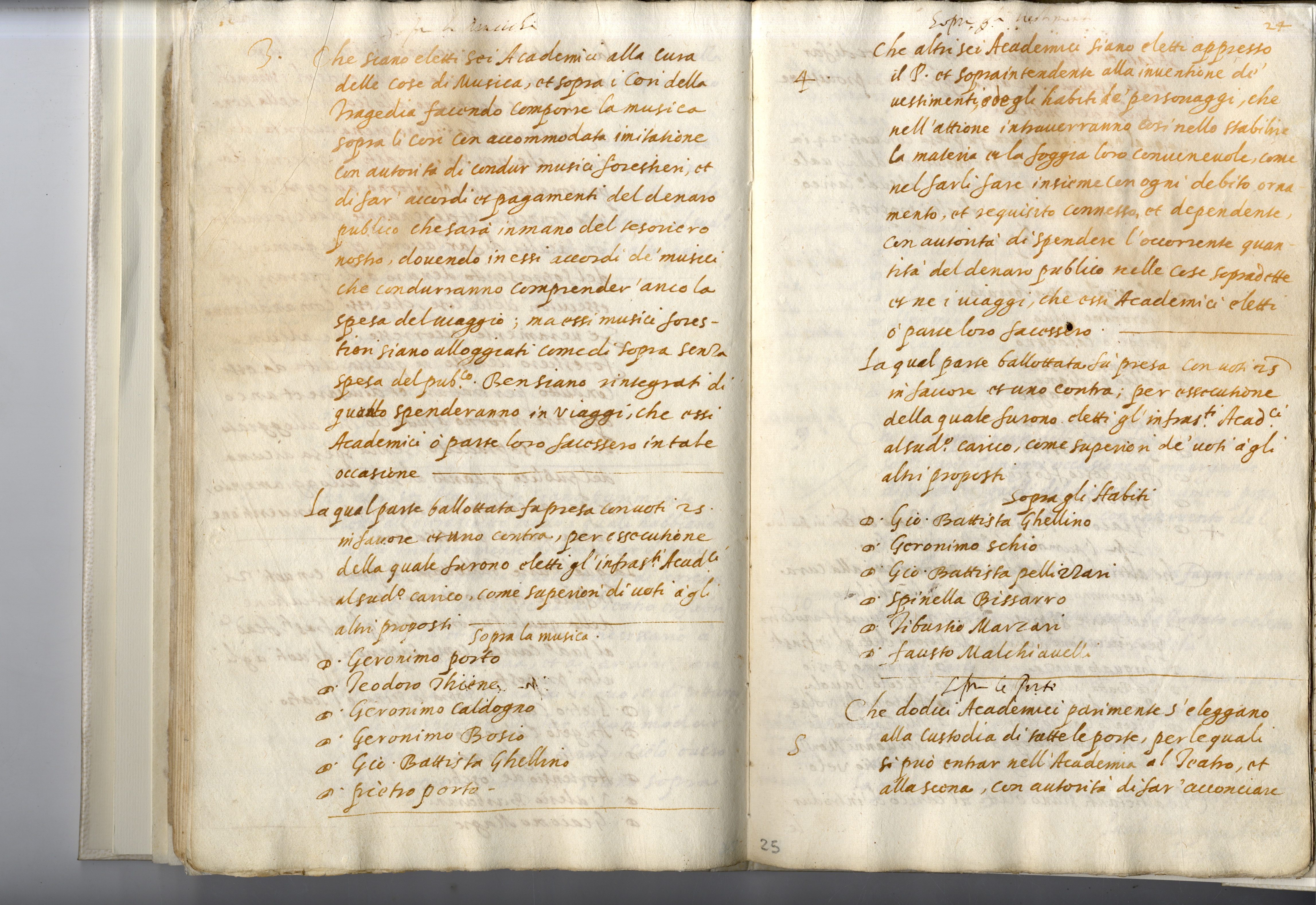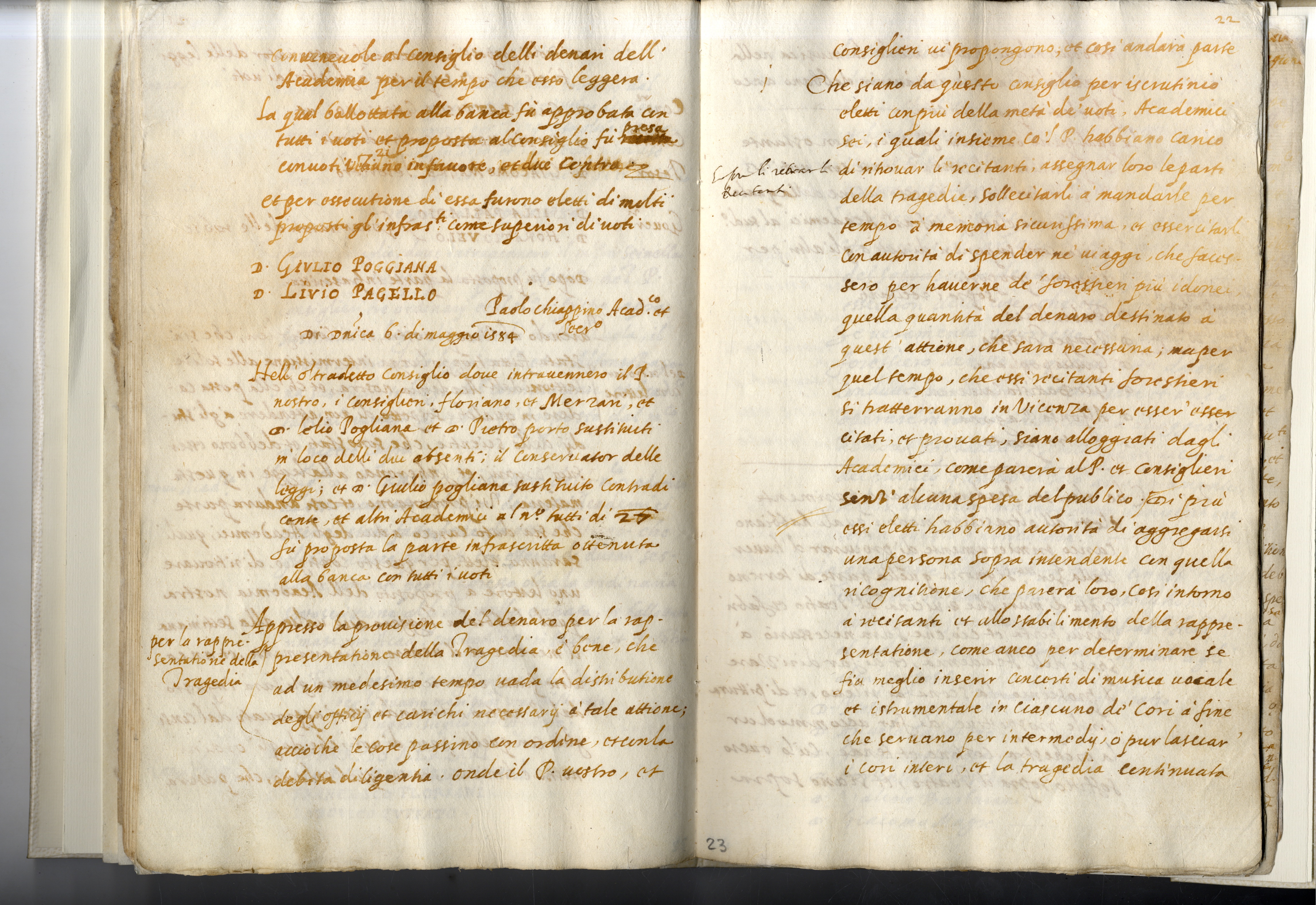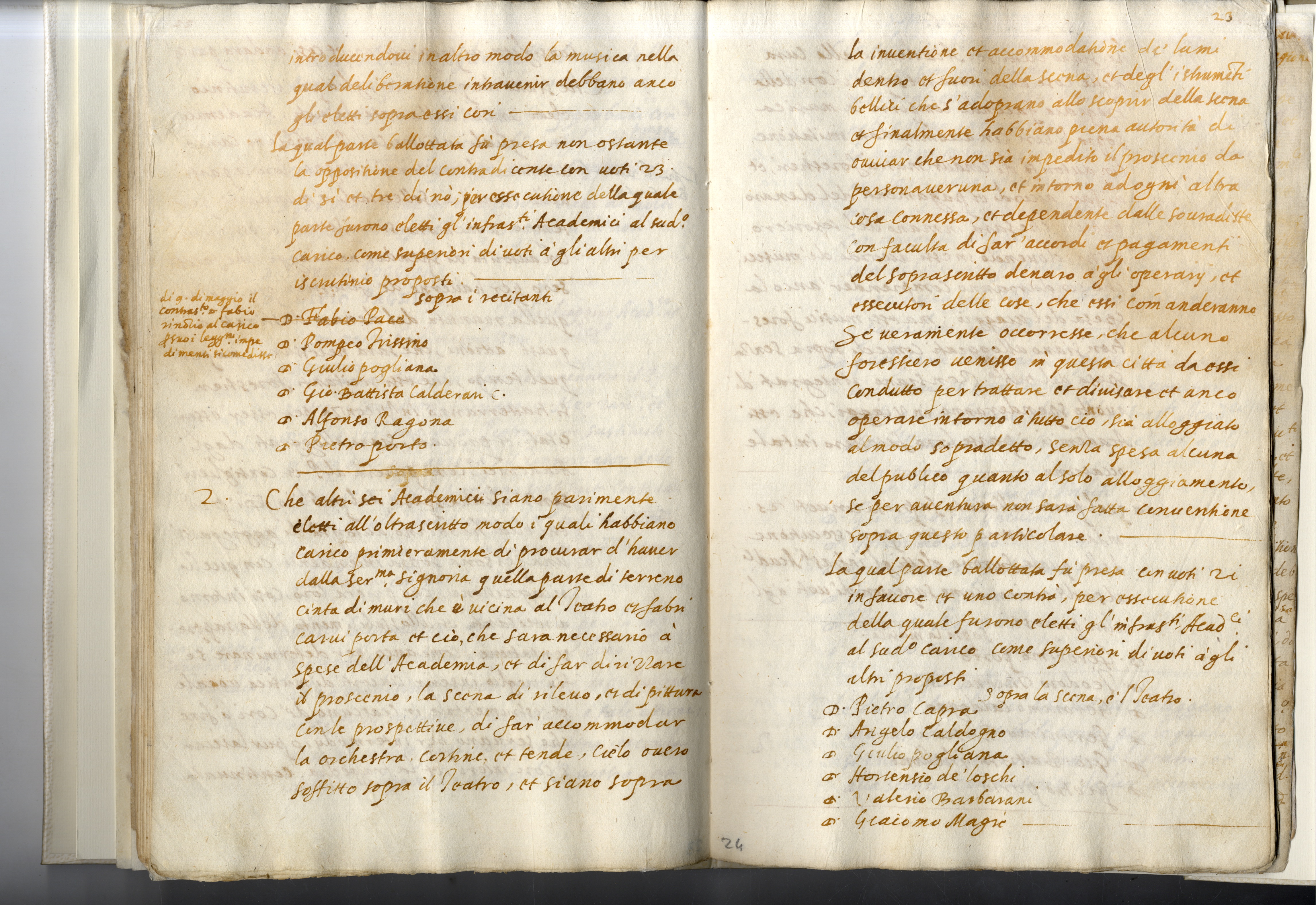 AO b1 fasc 5, libro segnato E pp 22v-26r – verbale di una importante riunione degli Accademici in merito all’organizzazione della rappresentazione inaugurale, 6 maggio 1584