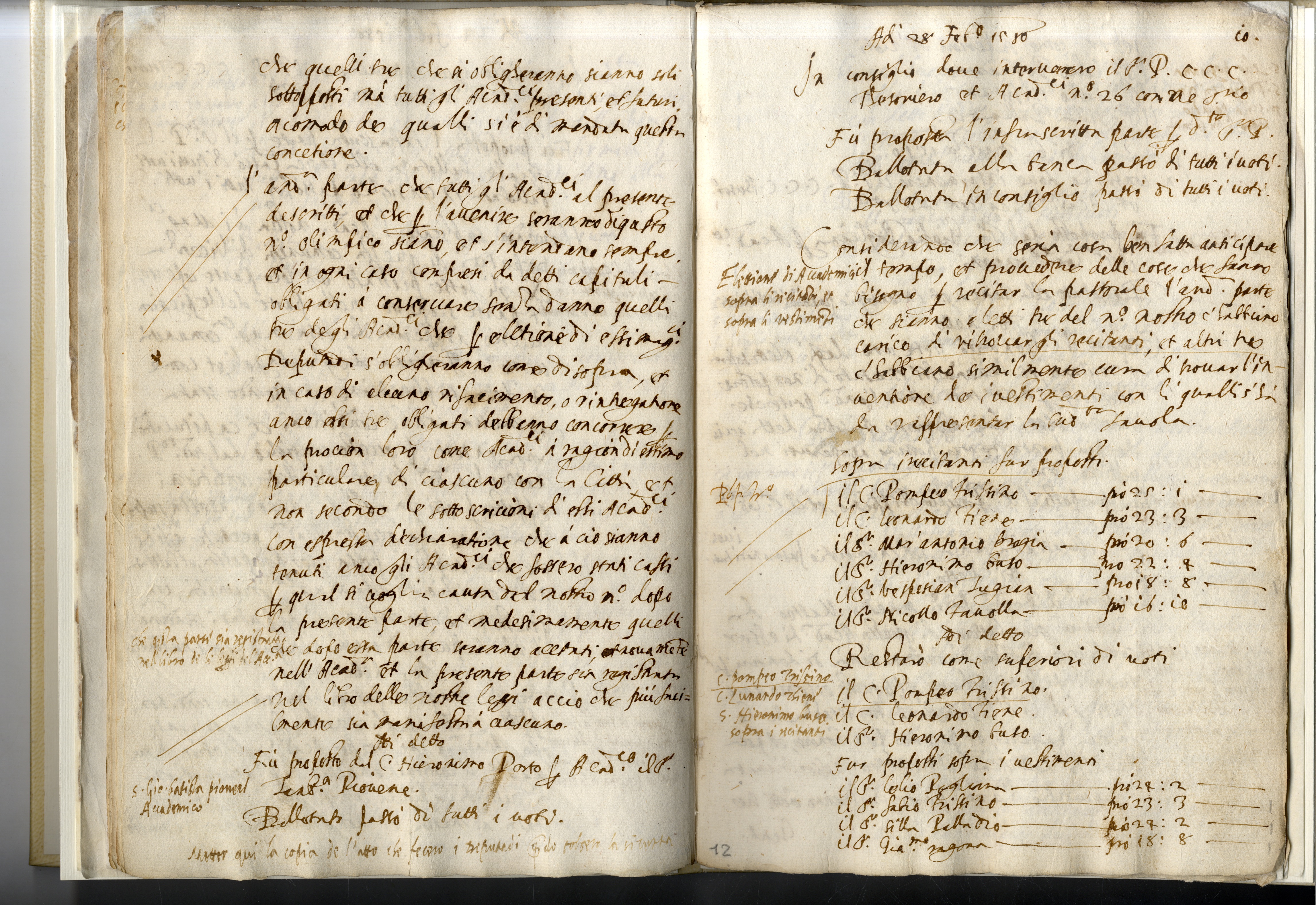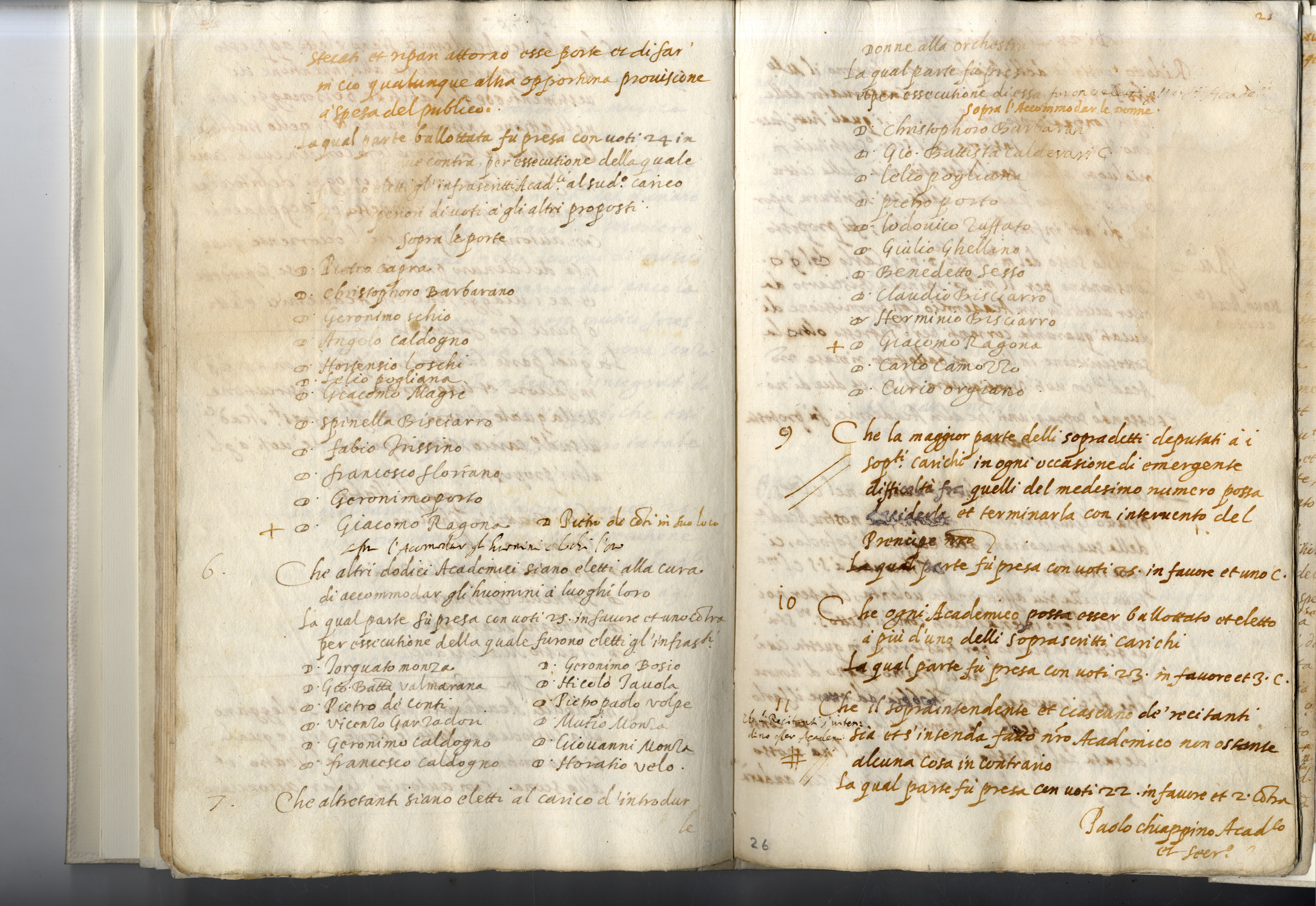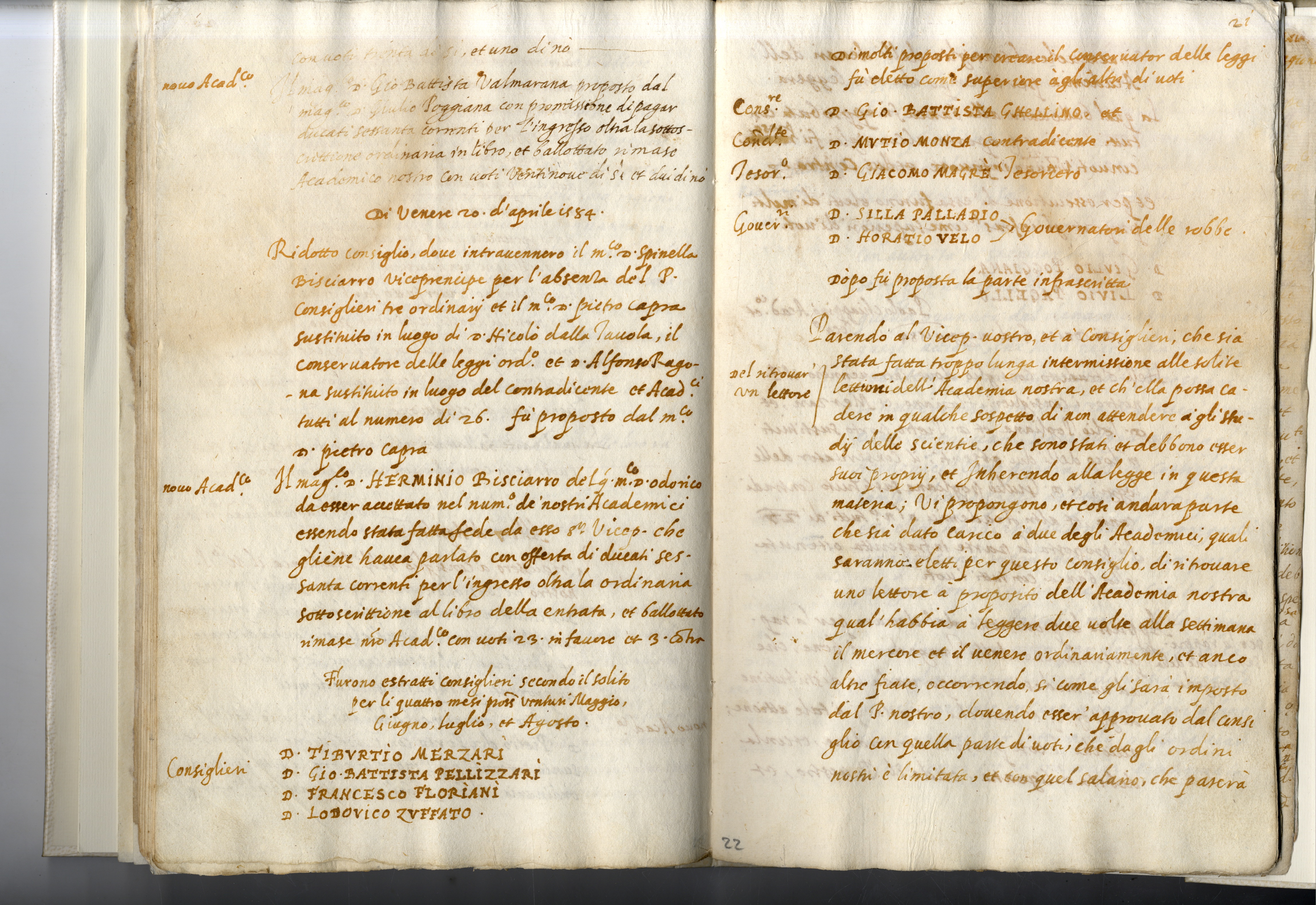 AO b1 fasc 5, libro segnato E pp 22v-26r – verbale di una importante riunione degli Accademici in merito all’organizzazione della rappresentazione inaugurale, 6 maggio 1584