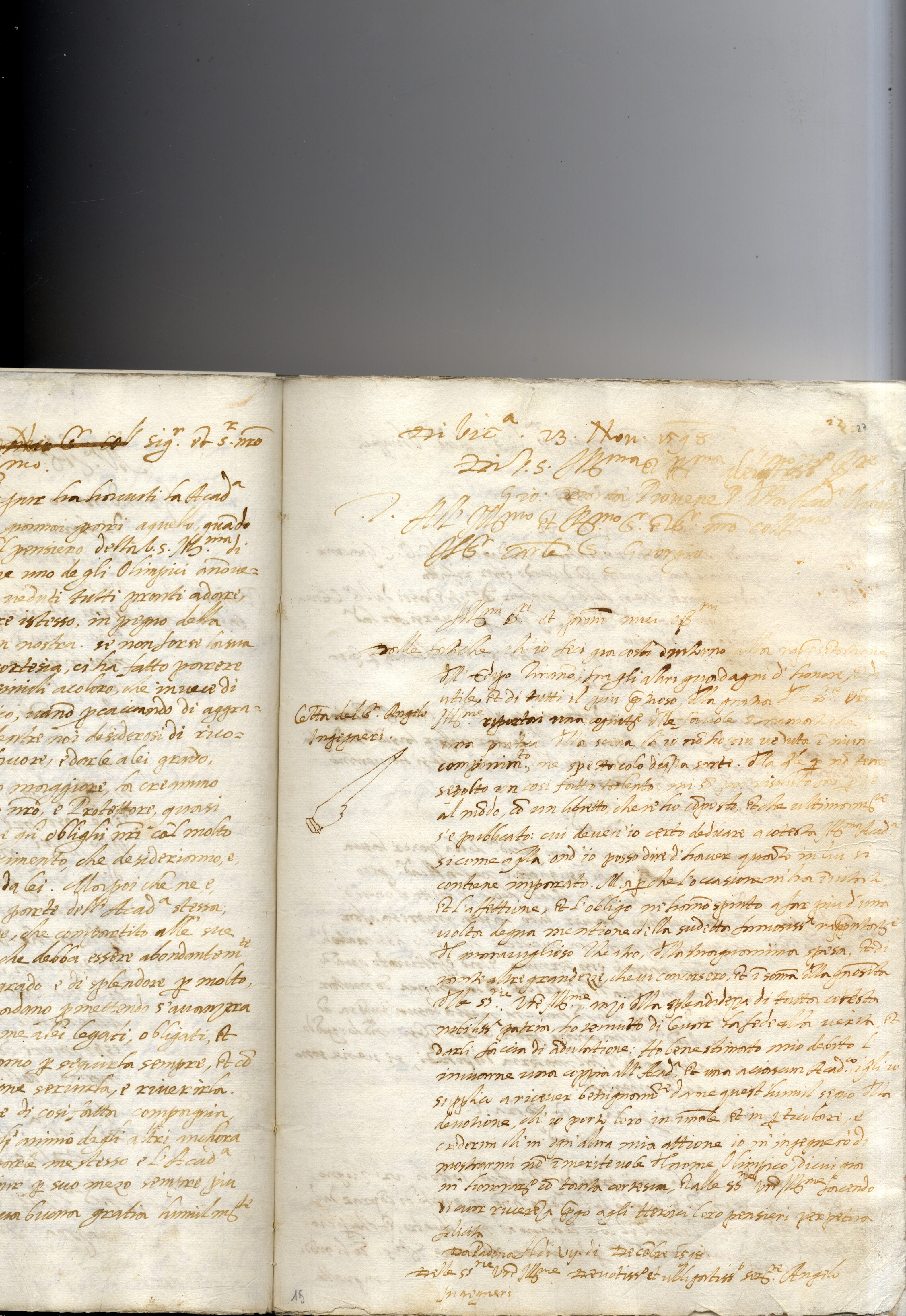 AO busta 1 libro G, f 27r – annotazione della lettera con cui Ingegneri spedì all’Accademia Olimpica il suo trattato Della poesia rappresentativa & del modo di rappresentare le favole sceniche (Ferrara, Baldini, 1598), 23 novembre 1598