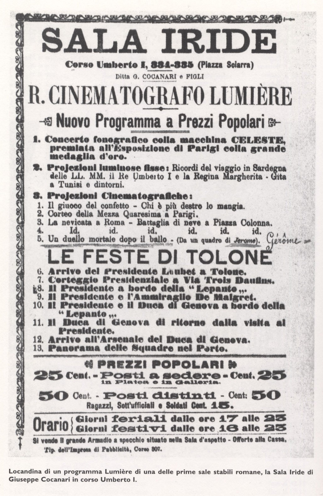 Una locandina della SALA IRIDE tratta dal volume CINEMA ITALIANO DELLE ORIGINI. GLI AMBULANTI, dell’accademico